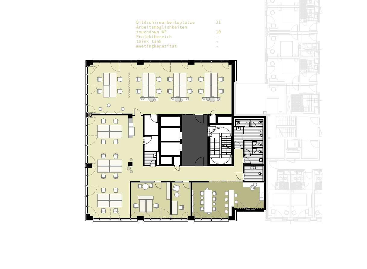 - KLIMATISIERUNG: Klimaanlage zur Kühlung sowie auch Heizung, Be- und Entlüftung (1,5- facher Luftwechsel auf Büroflächen; 5 -facher Luftwechsel in Meetingräumen, EDV-Raum klimatisiert
